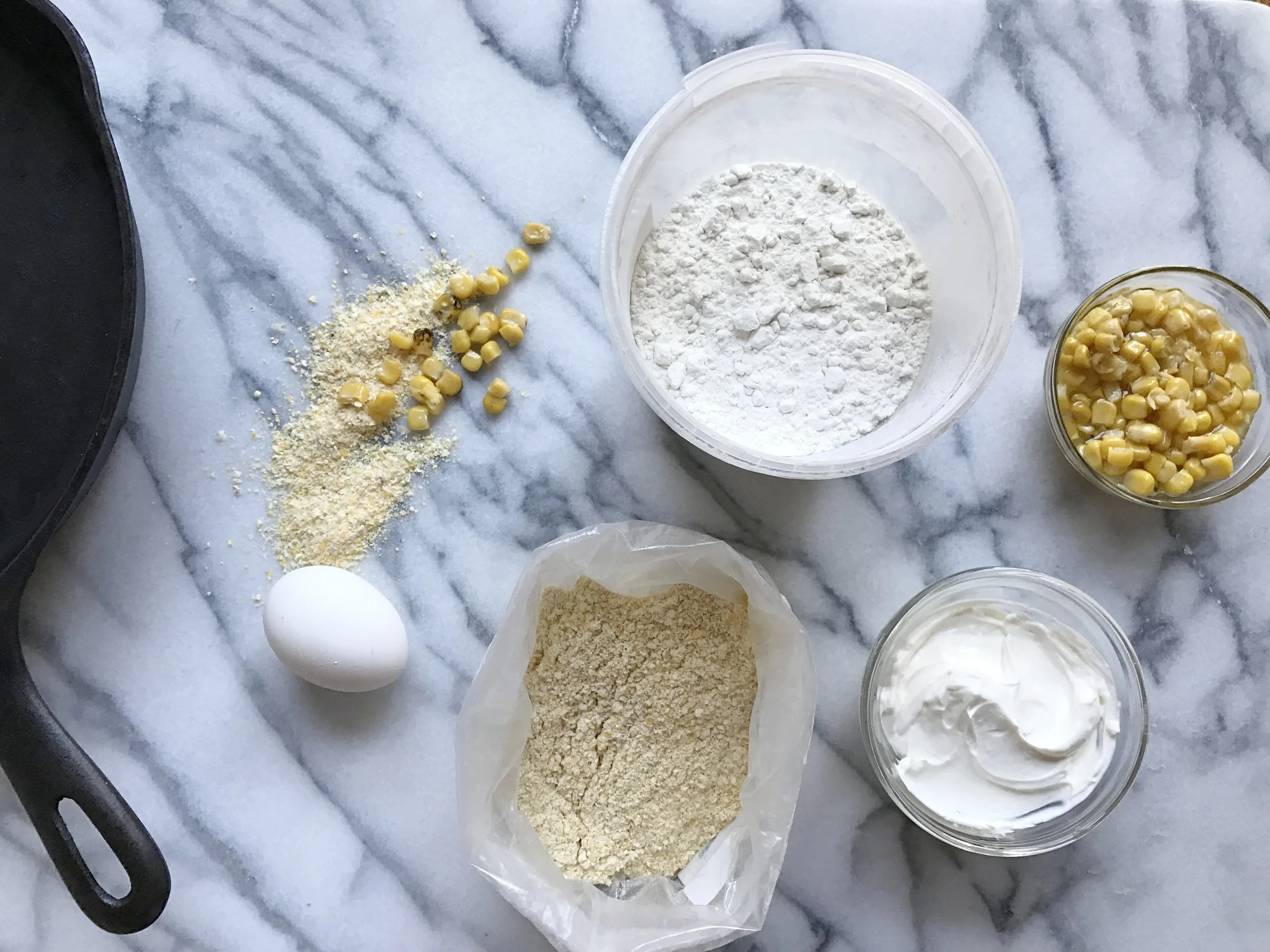 This is a take on a mennonite version my Mom made growing up. I can still picture how crusted over her recipe index card is from all the times she's made it. I've tried different versions but in order to get that perfect blend of crumbly bread with the moistness of a bread pudding, adding creamed corn and sour cream is what takes this over the edge. I’ve tried subbing out ingredients, using gluten-free flour for instance, and it's good but it never tastes like the real thing. Greek yogurt can replace the sour cream but thats about all you can sub out. Have a go at it. Dust off that cast-iron and tell me what you think. When the cornbread is still warm out of the oven, I like to whip up 4 tablespoons of butter with equal parts maple syrup or forest honey and a pinch of sea salt and dollop the bread with it when serving.