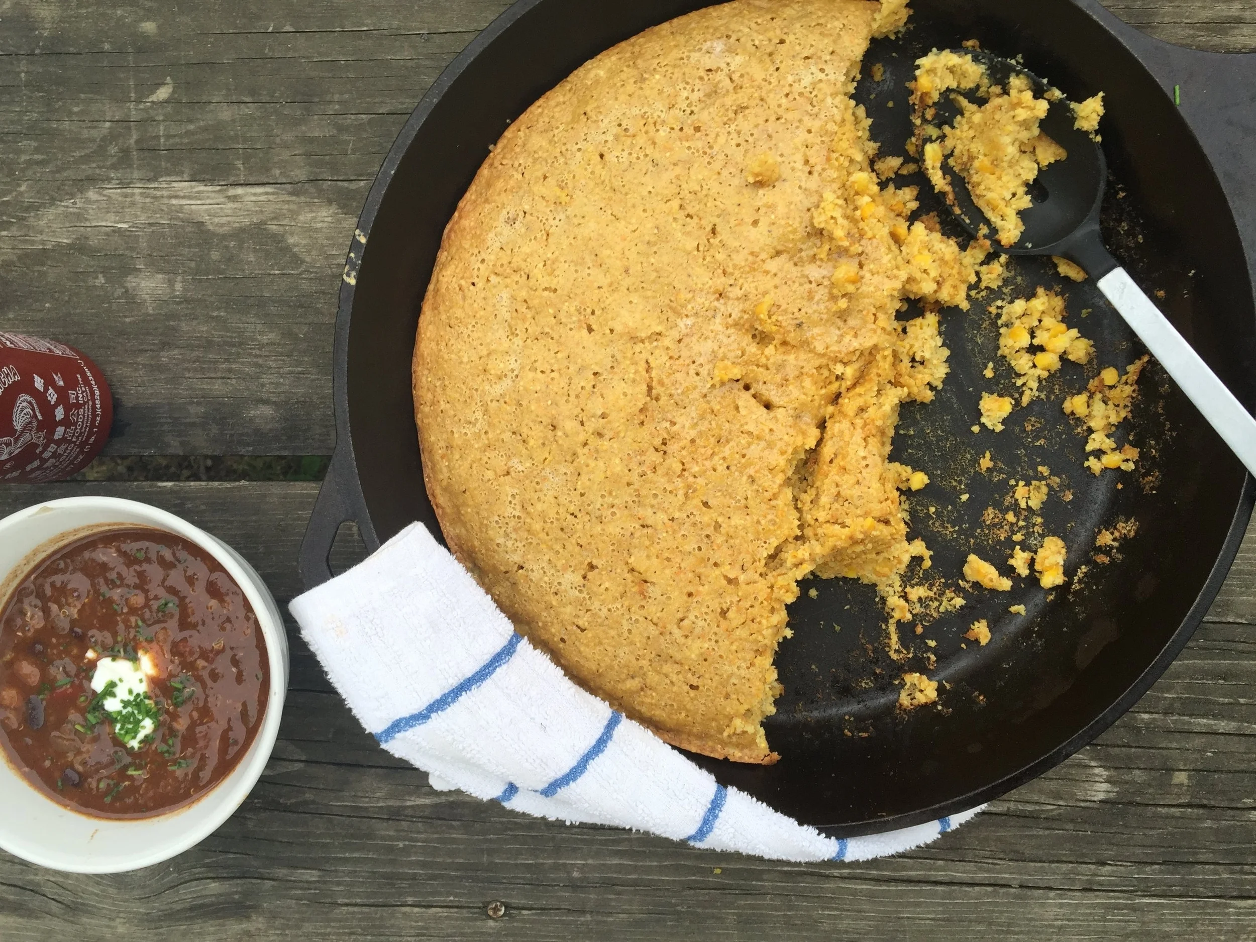 Over the years my pantry has become a cast iron sanctuary. Unless I'm running a restaurant, what can I possibly do with 4 identical cast iron skillets? Certain foods take on a smoky hint of the outdoors that just can’t be replaced with cookware like enamel or steel and good ol' cornbread is no exception. The way the cast iron divides up the heat throughout, makes this dutch style of cooking ideal for something like cornbread.