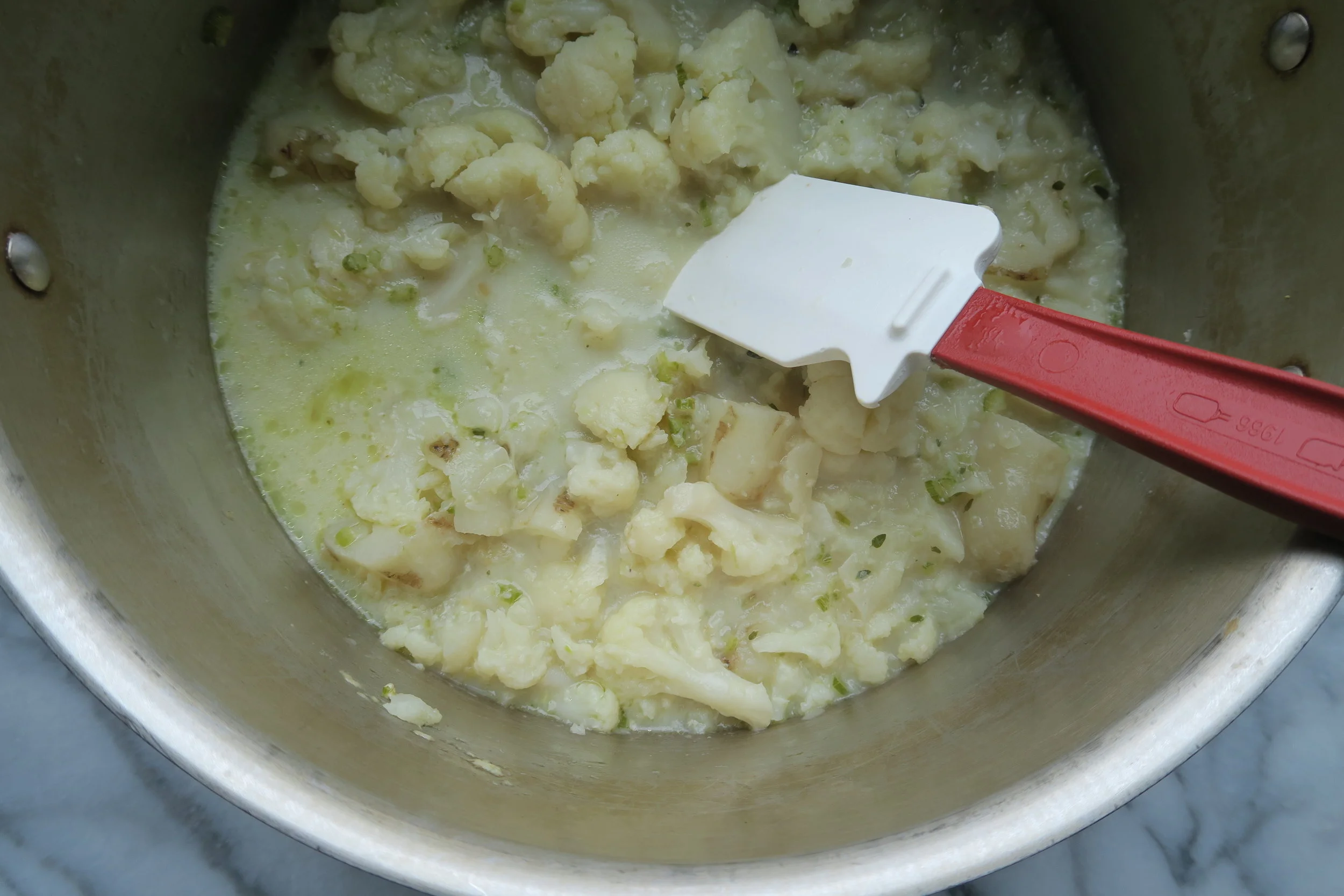 So rather than boiling the flavor out of them, you simmer sunchokes and cauliflower in broth and milk, almost like you’re steaming them. Cauliflower, which is milder when cooked, adds just enough sass without overpowering the sunchokes.