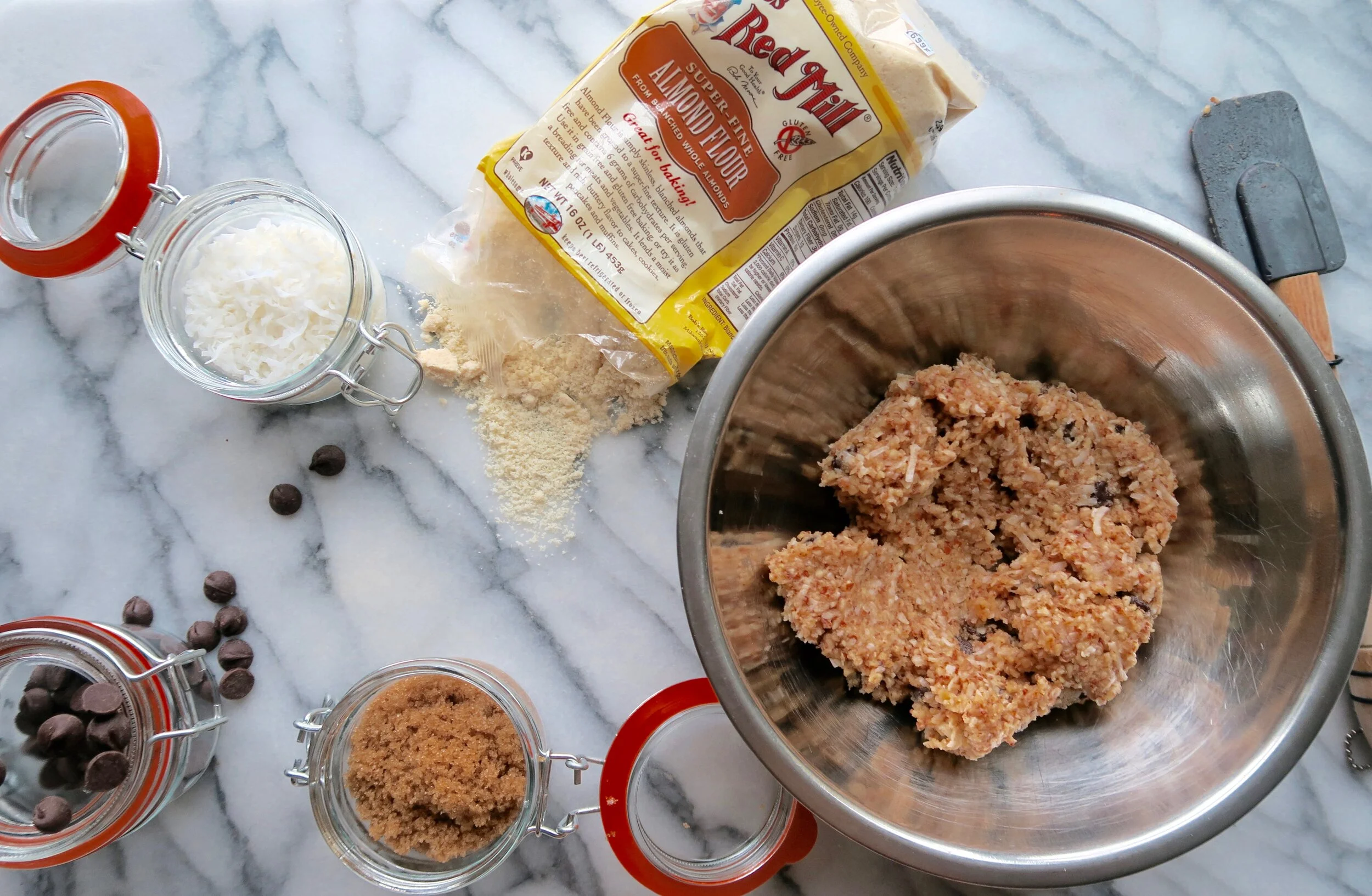 1. In a medium bowl, combine the almond flour, dark chocolate, coconut, sugar, cinnamon, baking powder, and salt.