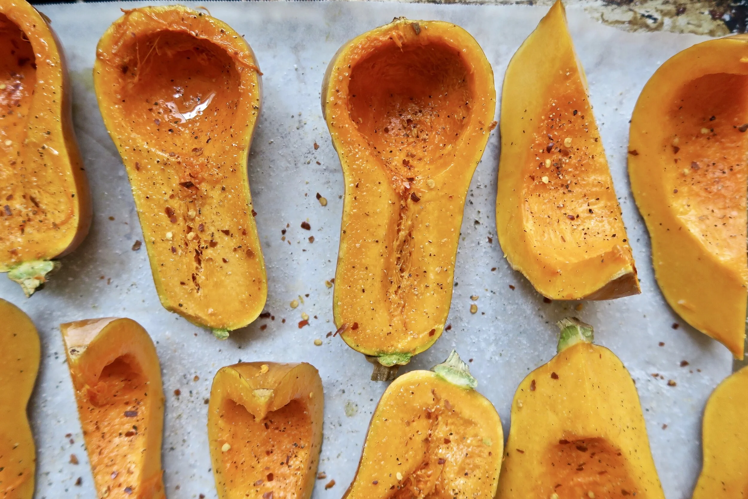 3. Toss the squash, either in a bowl or on your baking sheet, with 2 Tbsp olive oil, honey, chili flakes and a generous seasoning of salt and pepper. Spread out on one or two rimmed baking sheets and roast until tender and nicely browned on the skin side. 35-40 minutes depending on the texture of the squash. A fork should just pierce it.