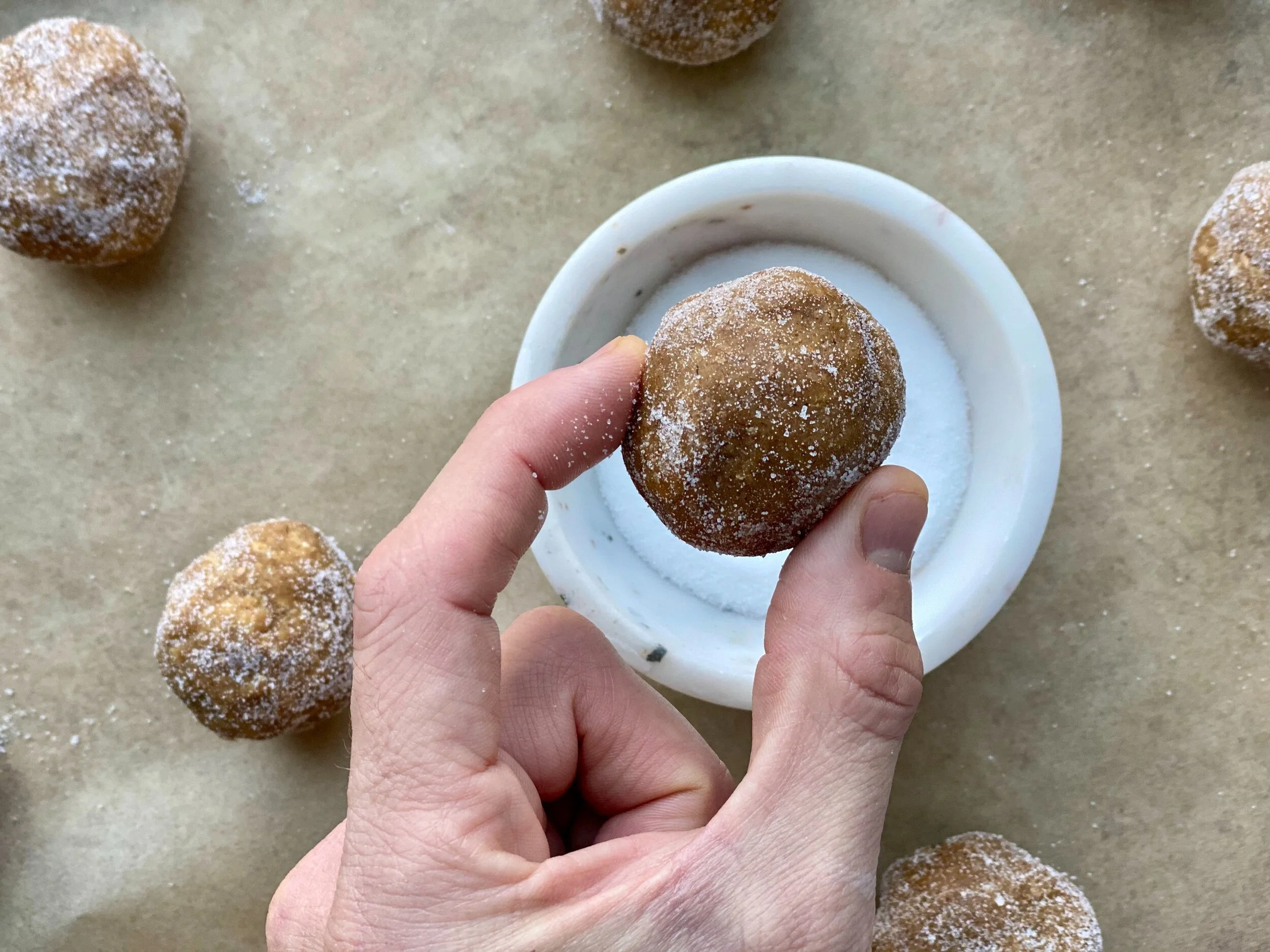 6. Use your hands to form the dough into balls, a little over 1 inch in diameter. You should end up with about 20ish balls. Fill a small bowl with sugar and roll each ball in the sugar until completely coated. Place dough on the lined sheet, leaving about 2 inches of space between them.